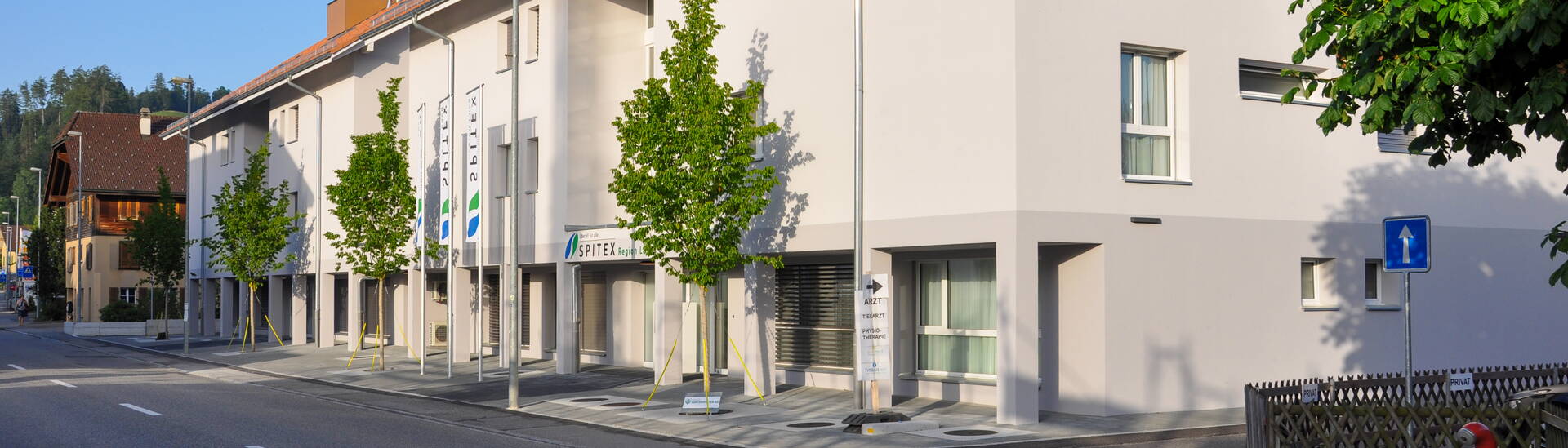 Die beiden Gebäude parallel zur Rüegsaustrasse werden mittels einem eingeschossigen Zwischenbau zusammengebaut. Darin befinden sich über zwei Geschosse die Spitex und pro Gebäude je drei Eigentumswohnungen.